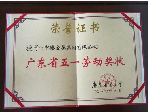 中德金屬集團(tuán)“廣東省五一勞動獎狀”榮譽證書