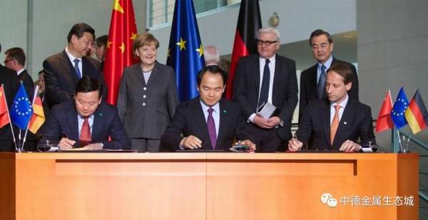 在國家主席習(xí)近平與德國總理默克爾共同見證下,揭陽市中德金屬集團(tuán)、廣東省廣晟資產(chǎn)經(jīng)營有限公司、德國歐綠保集團(tuán)三方共建的“中德資源再生基地”項(xiàng)目成功簽約,正式落戶中德金屬生態(tài)城,并于2014年5月31日舉行了中德葉綠寶資源再生基地奠基儀式。