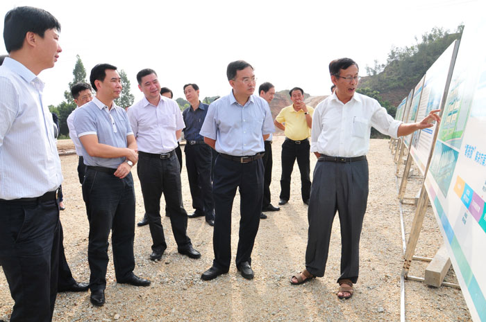 揭陽市常務副市長陳澄民向潮州副市長盧淳杰一行介紹生態(tài)城首期工程建設情況
