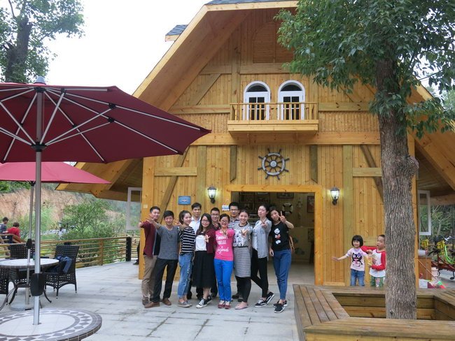 “壽星們”與活動負責人在特色布谷屋前合影,定格這歡樂一刻