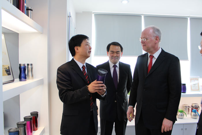 陳東市長首先對(duì)李進(jìn)軍副部長和魯?shù)婪颉ど碃柶较壬牡絹肀硎緹崃覛g迎,他向中德考察團(tuán)一行介紹了揭陽金屬產(chǎn)業(yè)發(fā)展的基本情況,揭陽金屬生態(tài)城建設(shè)為金屬產(chǎn)業(yè)轉(zhuǎn)型升級(jí)構(gòu)建大平臺(tái)。該項(xiàng)目是由行業(yè)協(xié)會(huì)專業(yè)運(yùn)作,項(xiàng)目定位為打造企業(yè)經(jīng)營可持續(xù)化、基礎(chǔ)設(shè)施智能化、產(chǎn)業(yè)生態(tài)化、生活綠葉化的健康良性“智慧金屬城”、“中國金屬之都”?疾靾F(tuán)隨后觀看了金屬產(chǎn)業(yè)宣傳片、參觀金屬企業(yè)聯(lián)合會(huì)和不銹鋼制品展示中心。