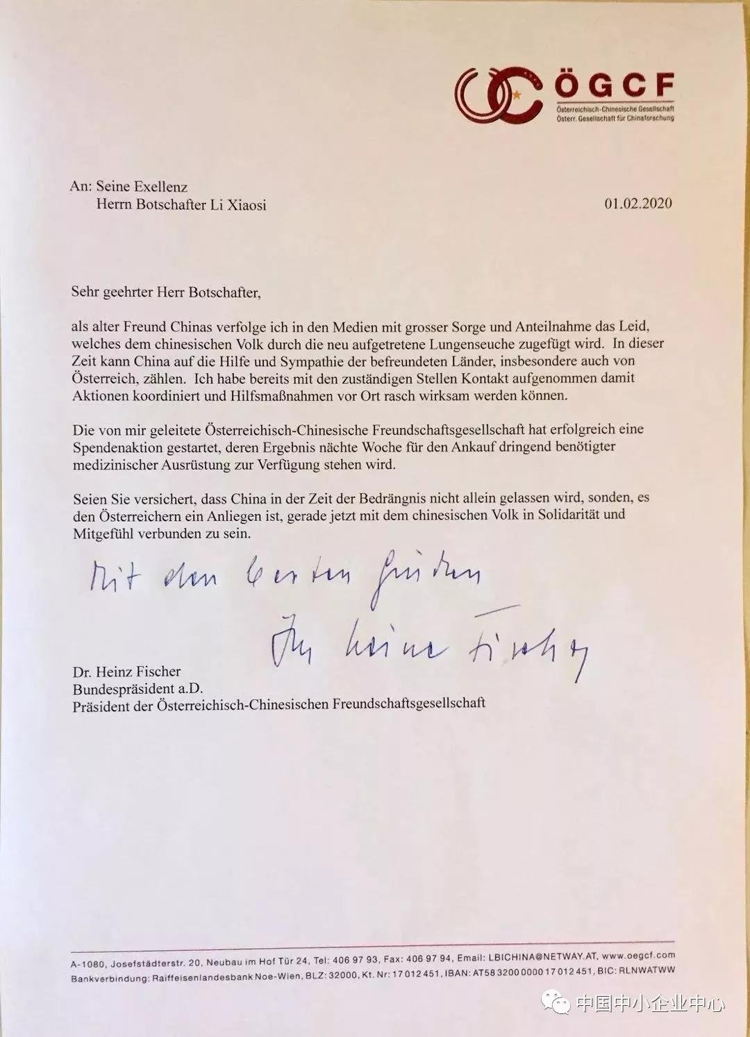 大愛無疆,同心抗疫。中心駐奧地利顧問卡明斯基教授協(xié)調(diào)奧中友協(xié)主席、奧地利前總統(tǒng)菲舍爾在疫情期間也發(fā)表了致中國人民的講話慰問視頻,并致信中國駐奧地利大使李曉駟,對中國抗擊新型冠狀病毒肺炎疫情表示積極支持并愿意施以援手的聲明。