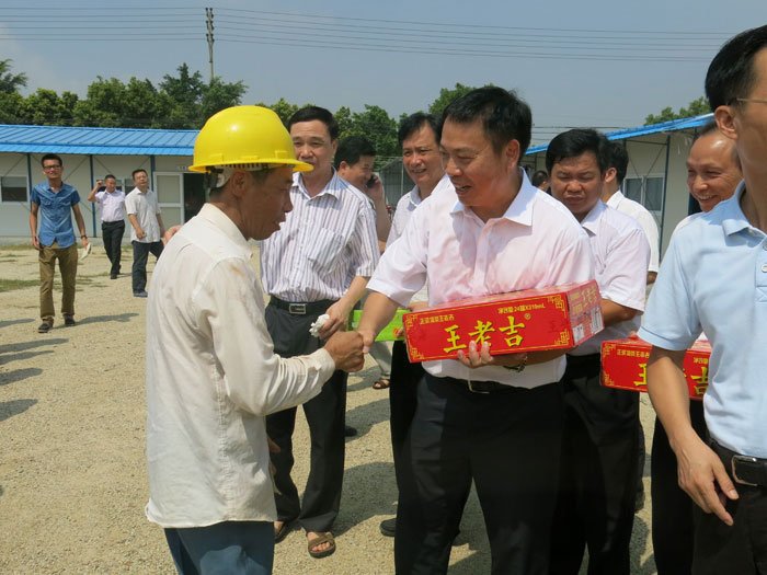 市、區(qū)有關(guān)領(lǐng)導(dǎo)向工地職工送上王老吉等解暑飲品