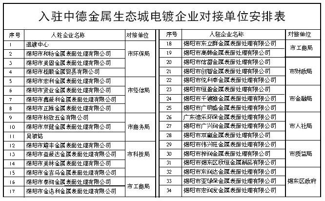 為貫徹落實(shí)全市電鍍產(chǎn)業(yè)發(fā)展推進(jìn)會(huì)會(huì)議精神,全力加快中德金屬生態(tài)城電鍍園區(qū)建設(shè),努力打造綠色電鍍產(chǎn)業(yè)高地,全市各地各部門主動(dòng)作為,加強(qiáng)協(xié)調(diào),形成合力,結(jié)對(duì)支持,切實(shí)幫助入駐園區(qū)電鍍企業(yè)解決投產(chǎn)建設(shè)過程碰到的各項(xiàng)問題,助推企業(yè)盡早投產(chǎn)運(yùn)營。根據(jù)安排,市環(huán)保、經(jīng)信、商務(wù)等部門和揭東區(qū)政府等十家單位將對(duì)首批34家入園電鍍企業(yè)進(jìn)行結(jié)對(duì)支持。
